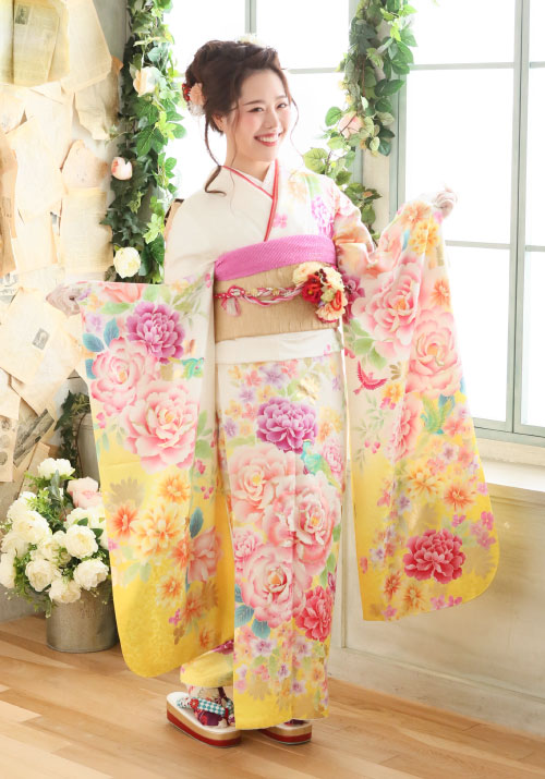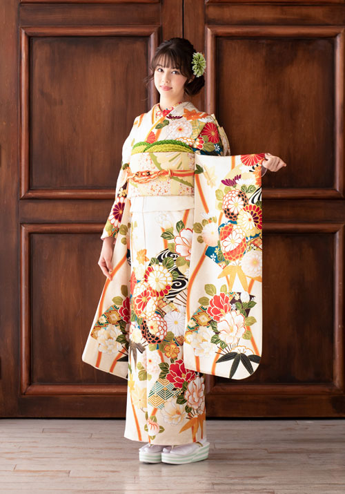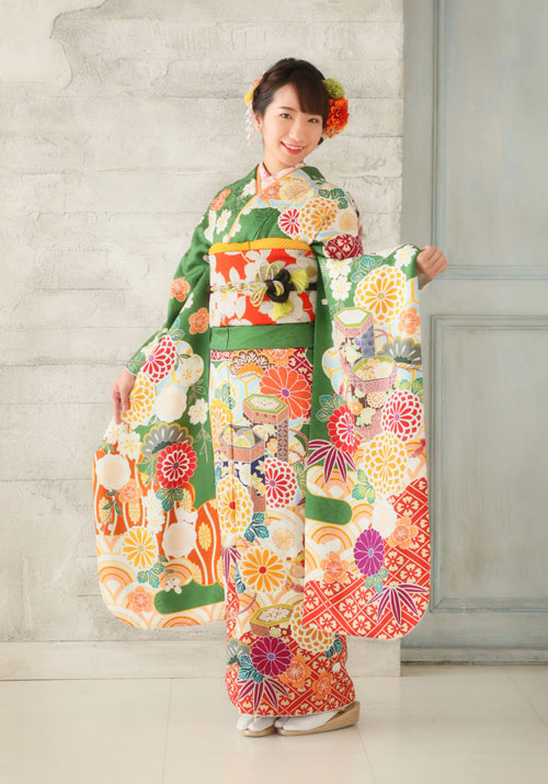 《振袖レンタルセット内容》 振袖、帯、長襦袢、襟芯、帯締め、帯あげ、重ね襟、前板、後ろ板、三重仮紐、帯枕、腰紐、ガーゼ、伊達締め、足袋、肌着、草履、バック、半襟、コーリベルト、タオル、Yたい、小判、腰パット、衣装ケース(計25点)