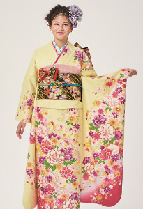 京都きもの友禅の魅力は、なんといっても高品質な振袖とその種類の豊富さ。毎年150種以上の新作が加わっているというから驚きです。「成人式が終わったあとも一生着られる着物を届けたい」という思いから、国内の熟練和裁士が一点ずつ丁寧に仕立て、社員が工場で製作行程をチェックしているのだそう。また、京都きもの友禅独自の仕入れルートを持っており、レンタルも購入もリーズナブル。店頭では一目で金額がわかるよう、小物を含めた価格表示をしているのも良心的です。