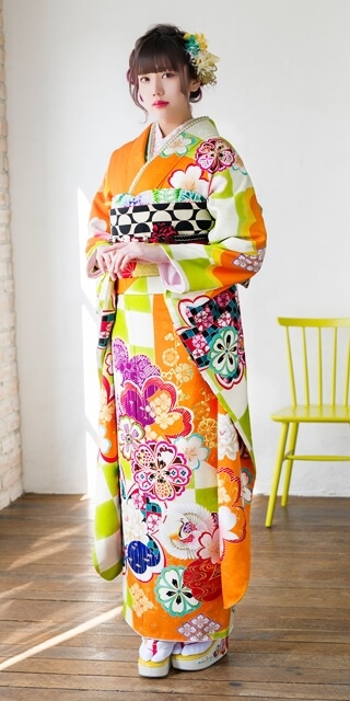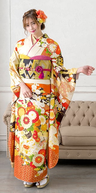 振袖・長襦袢・袋帯・帯揚・帯締・重ね衿・半衿・衿芯・前板・後板・帯枕・腰紐5本・伊達締め2本・コーリンベルト1本・三重仮紐・肌着・裾除け・足袋・草履・バッグ