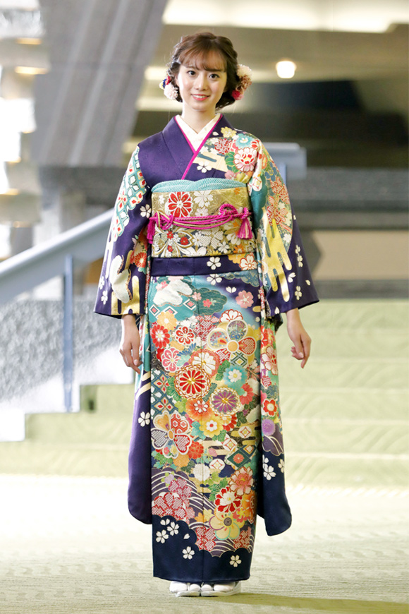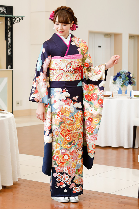 1.振袖2.羽毛ショール 3.袋帯 4.帯上げ5.帯締め